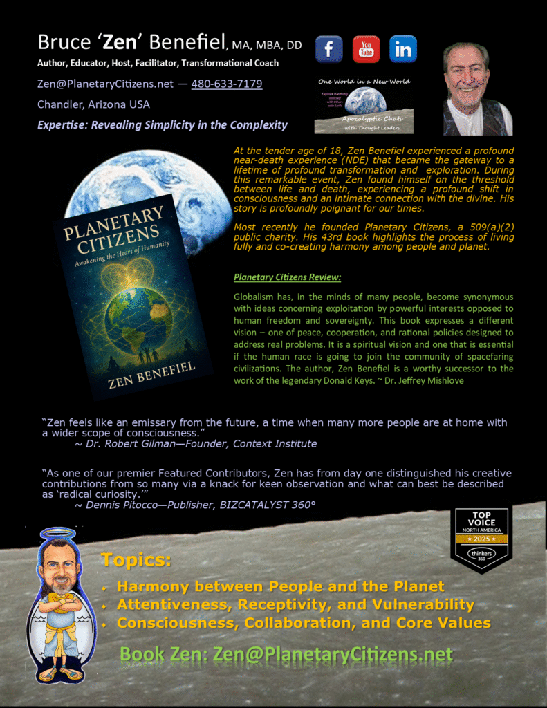 Zen Benefiel’s life journey, marked by a transformative NDE, enlightening interviews, profound authorship, hosting of a transformative podcast, and captivating presence as a podcast guest, establishes him as a beacon of inspiration and transformation. His words and experiences touch the hearts and minds of individuals around the globe, encouraging them to embark on their own journeys of self-discovery, inner growth, and collective awakening. Download his One-Sheet by clicking HERE.